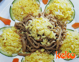 '1.将羊里脊去外筋洗净,切成宽、厚各0.3厘米的细丝;