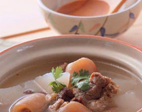 薏仁苓术羊肉煲:'1.将羊肉、白萝卜切成块;2.姜切成片,葱切成末备用;3.将羊肉、羊脊骨放入开水里焯去血腥味,捞出在清水里洗净,然后放入砂锅里;4.加入姜片、苍术、...
