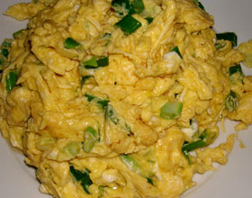 野葱炒鸡蛋:'1.将野葱摘洗干净,切成细末,放碗内。将鸡蛋打入碗内,与野葱、精盐搅打均匀。2.炒勺置旺火上,加花生油烧至六成热,倒入蛋液翻炒至熟,装入平盘即可...