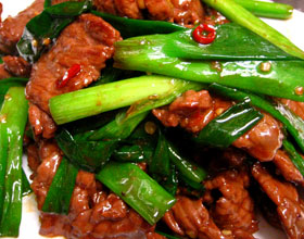 野葱炒牛肉:'1.将野葱去杂洗净切段;2.牛肉洗净切片,放大碗内加入料酒、精盐、味精、酱油、姜丝腌渍一会;3.锅放油烧热,倒入牛肉煸炒熟而入味;4.放入野葱炒至入...