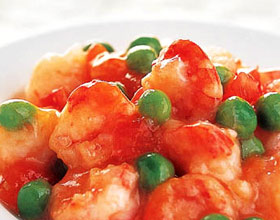 4.高汤煮滚后加入番茄酱、盐、糖10克、醋10克、味精5克,待再滚起时用生粉水勾芡,倒入虾仁、豌豆拌匀,盛起置于汤碗中。