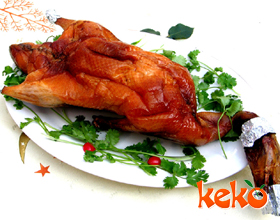 7.然后将火拨旺,再烤至鸭皮吱吱作响,毛孔微微冒出油花,皮色呈金红色时离火退叉;