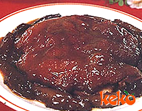3.肘子反扣大盘中央,将海参围摆一周,用原汤调味,调色,水淀粉勾浓芡,淋明油浇在海参和肘子上即成。