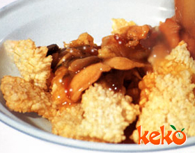 主料: 海参(水浸)150克 鸡肉100克 锅巴(小米}200克