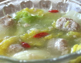 2.锅中放清水750克烧开,放白菜丝,随即用手将羊肉馅挤成枣子大小的丸子,放入锅内,待汤再开,撇去浮沫,放入余下的盐,料酒即成。