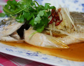 清蒸加吉鱼:'1.将加吉鱼刮去鳞,掏净鱼鳃、内脏,洗净,在鱼身上打1.7 厘米见方的柳叶花刀;2.剞好刀后再放入开水中一烫即捞出,撒勺细盐,整齐地摆入盘内;3.猪肥...    详细介绍