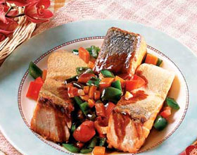 彩虹鱼丁:'1.加吉鱼,宰杀,清洗干净;2.鱼切成大丁形状;3.鱼块加白酒5克、盐3克、淀粉3克、味精1克、胡椒粉2克,搅拌均匀后待用;4.青、红椒切小丁;5.姜切片...    详细介绍