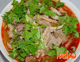 羊杂碎汤:'1.将鲜羊肚洗净,揩掉油,放至即将开的水锅里烫一下,捞出,放案板上刮去肚毛,洗净备用;羊肥肠反复洗净,用筷子穿翻地来,盘起用绳子拴住;将羊心洗...