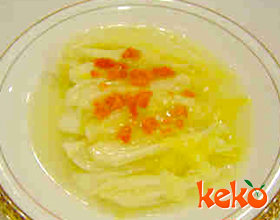 6.先将白菜块捞入汤碗中,用筷子逐块理成条状,摆齐,再在锅内汤汁中加入蟹黄、黄酒略烩,倒在白菜上即成。
