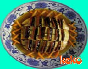 14.再取火腿丝摆在鸭子的皮面上呈网状,象征葵花籽;