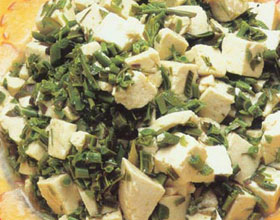 椿头拌豆腐:'1.嫩豆腐切一厘米的丁,椿头用盐卤后切末。2.将豆腐加盐、味精和香油搅拌入味,撒上椿头末即成。...    详细介绍