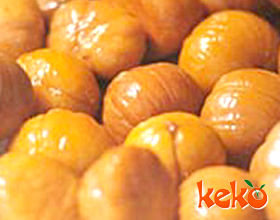 桂花板栗:'1.用刀在板栗鼓起的一面切一字刀,下入开水锅中烫一下捞出,把板栗肉取出,切去黑烂变质的部分,再切成1厘米见方的丁。2.将猪油烧到六成热时,下入板...