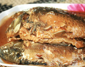 5.炒锅内加入熟猪油烧热后放入葱姜末,炒出香味后,再加入黄酒、清汤300毫升、酱油、味精、精盐、白糖,随即将炸好的鲫鱼放入锅内,烧沸后改用小火煨焖;