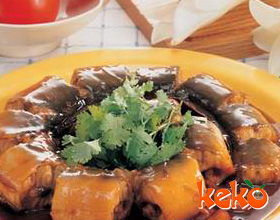 5.至汤汁约剩1/4 时,拣去姜片等,放入酱油、白糖、醋,用旺火收浓汤汁,淋上熟猪油,用手勺摇推均匀,淋上香油即成。这是一道宁波地方风味菜。