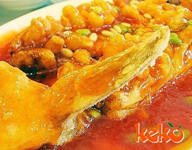 7.锅中汤汁去掉葱姜加入卤汁烧沸勾芡,淋于桂鱼上,再撒入豌豆仁、胡椒粉即成。