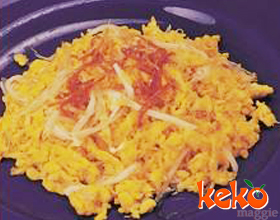 6.拌匀的蛋液内放进散翅、腊肉末拌和;