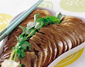 3.熟猪心,取出,凉后剖开切成薄片,放在盘中;