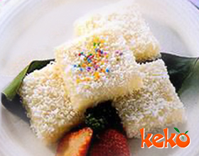 3.将木薯粉、糯米粉、椰子汁放入锅中,拌匀,用小火边煮边搅匀至熟,浇在玉米糕上摊平,冷却后切成菱形,装盘,即可食用。