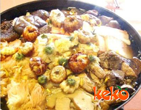 菊花锅:'1.鸡肫去皮片成薄片,放入碟中,摆成牡丹花形;2.猪瘦肉片成长薄片,放入碟中,摆成喜鹊和梅花形,称“喜鹊登梅”;3.将香菇洗净去蒂切成丝,作为梅花...