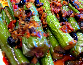 酥炸茄饼:'1.将猪五花肉、葱、姜、蒜切成末,加入调料制成肉馅。2.茄子洗净,斜切夹刀片,将肉馅填充其中,挂上用鸡蛋、面粉、水调成的糊备用。3.锅内注油烧热,...    详细介绍