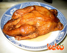 3.把炸好的鸡放入锅内加清水(以漫过鸡为适),加药料包(即桂皮、丁香、花椒、陈皮、砂仁、草豆蔻、山奈、大料、小茴香、白芷)、生姜(用刀稍拍)、精盐、口蘑、酱油,用铁筷子将鸡压住,置旺火上烧沸,撇去浮沫,移至微火上焖煮(保持似开非开,不能滚沸),至鸡酥烂时即可,煮鸡时间要根据不同季节与鸡的老嫩而定,捞鸡时切勿损坏鸡皮影响美观,煮鸡的原汤可留作下次煮鸡时继续使用,鸡肉香味更加醇厚。
