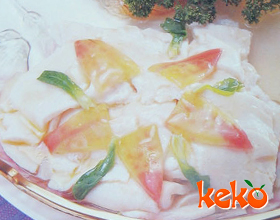 3.炒勺置旺火,放入花生油,烧至四成热,下蛋清糊,用手勺轻轻推搅,当蛋清糊结成片状时,倒入漏勺沥油,即为,“芙蓉鸡片”;